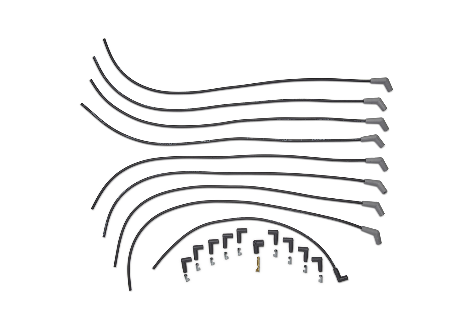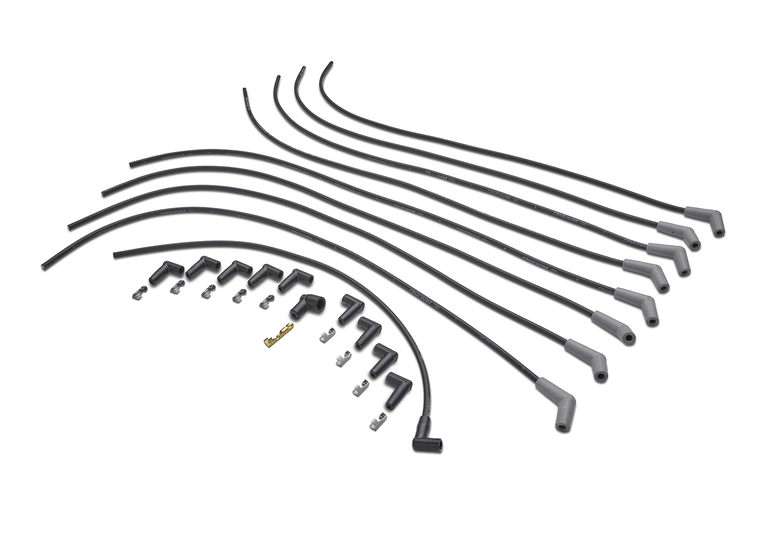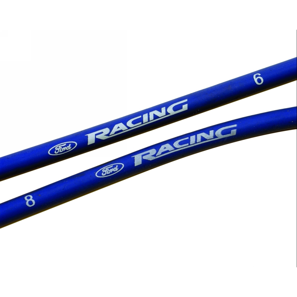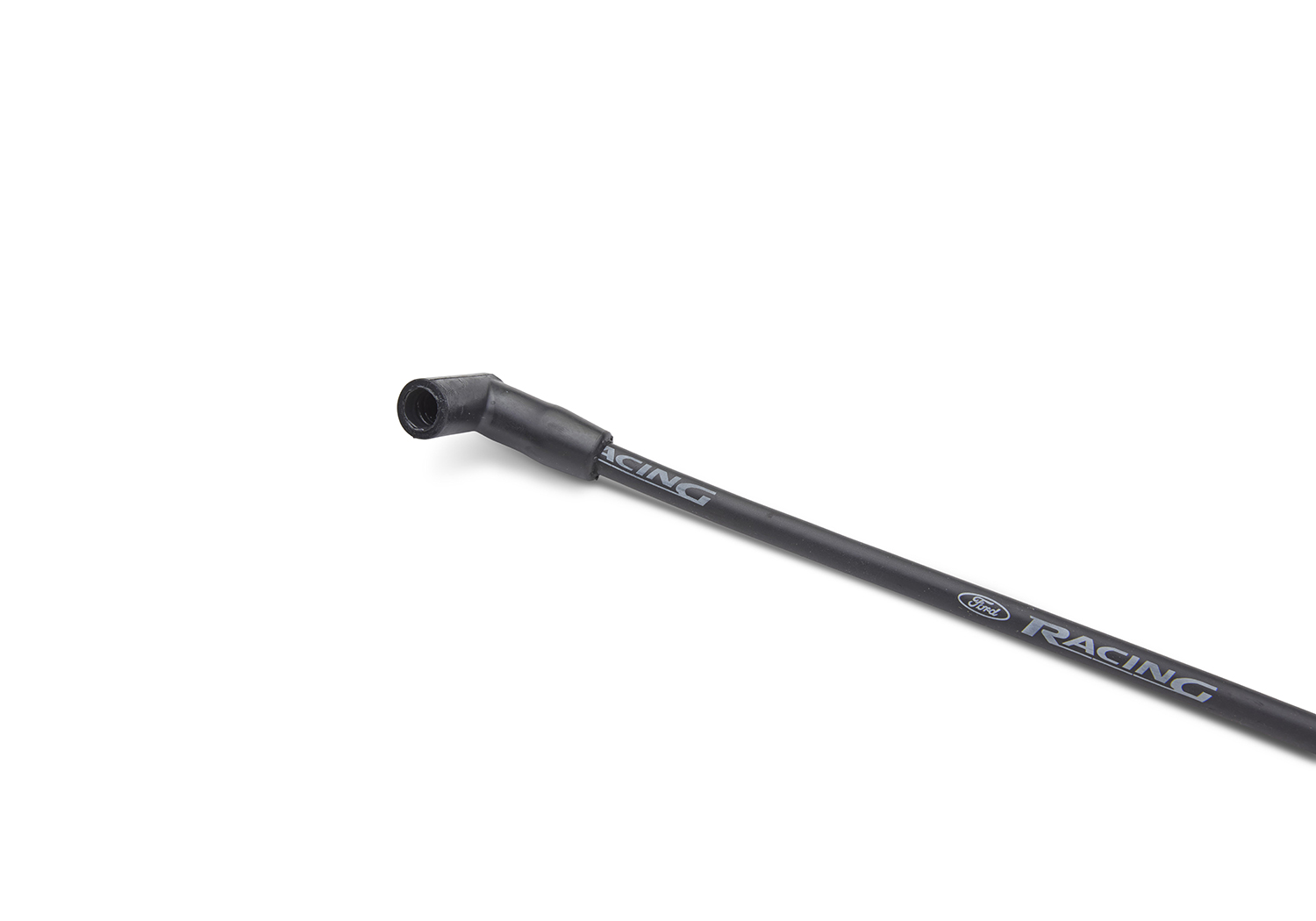 Wire-wound custom ignition wire sets feature low resistance for minimum spark loss. Silicone insulation and boots withstand high temperatures and voltage loss for minimum cross-fire and are highly resistant to fuels, oils and solvents. Long-life, tough stainless steel terminals for “post” type distributor caps. Includes coil wire for socket-type coil and “Ford Racing” identification. Cylinder number appears on each wire.