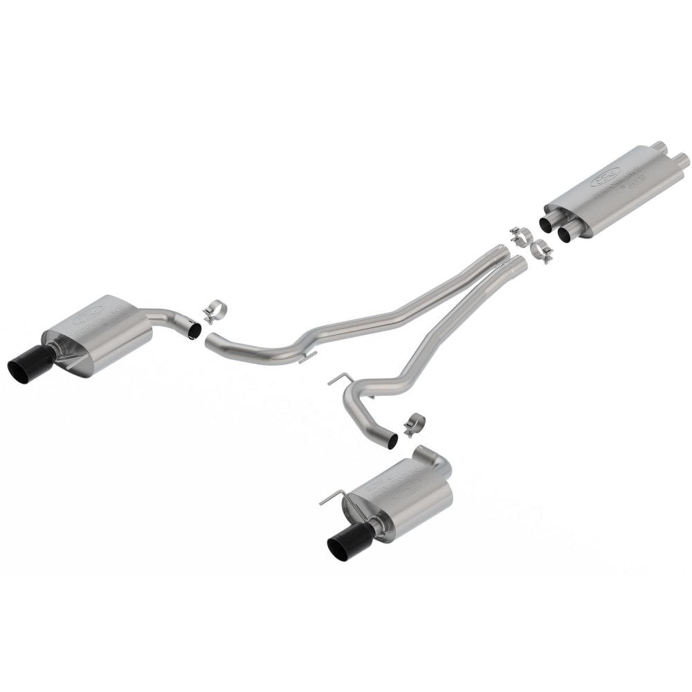 This cat-back exhaust system bolts directly to the stock factory catalytic converters, making your Mustang 100% emission compliant while providing an aggressive muscle car sound. The tuned stainless steel mufflers with 4" chrome-plated stainless steel tips not only sound great but look great too.