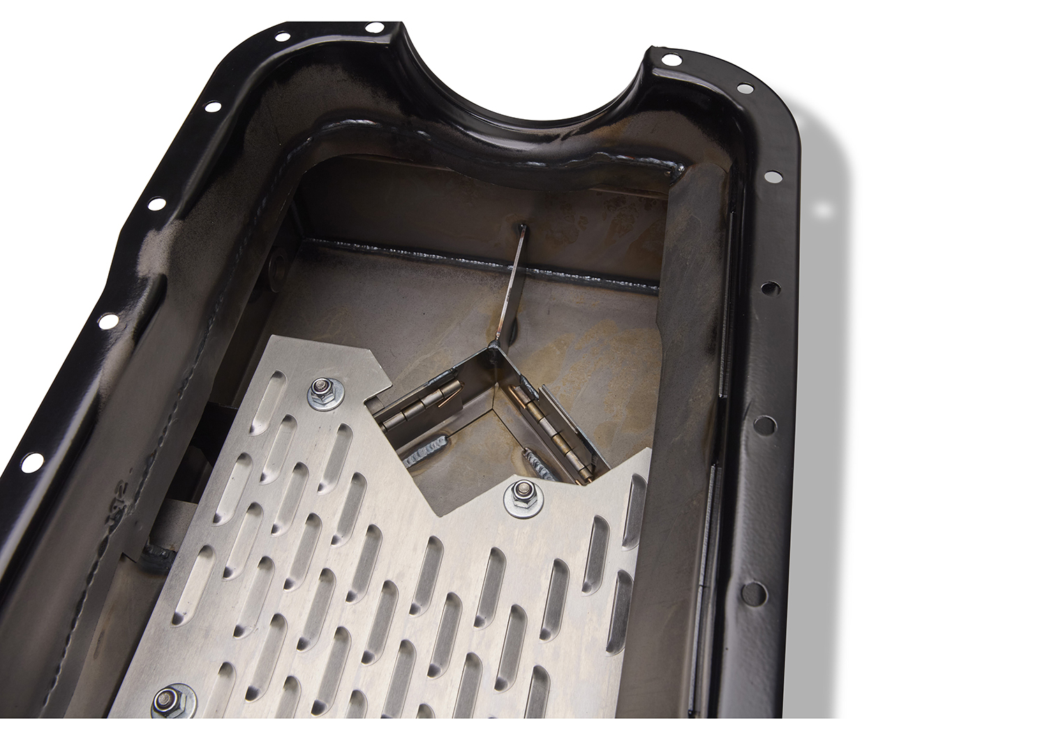 - Baffling and trap doors in the sump to keep the pickup submerged during performance driving