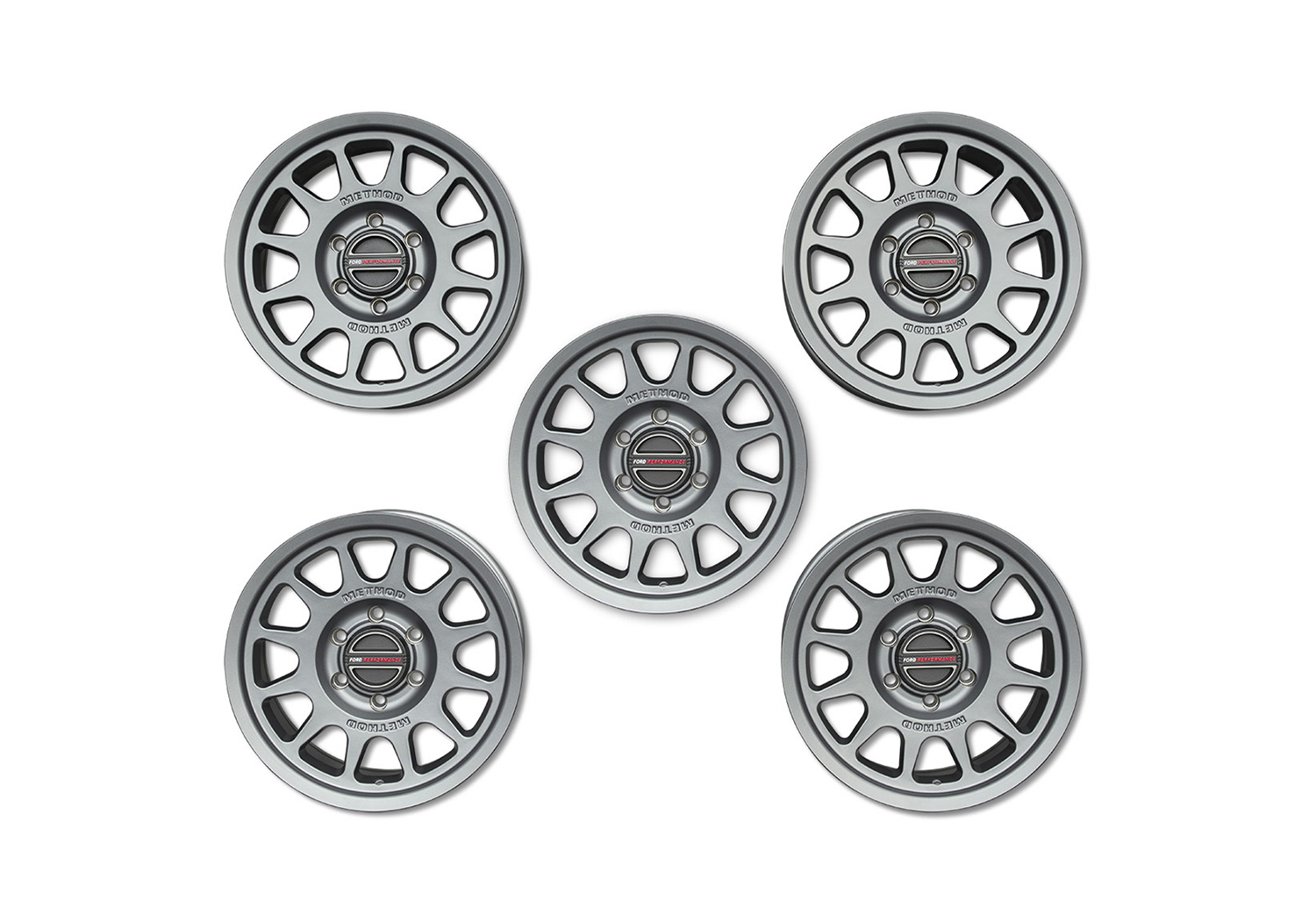 - 5 Snap-in center caps with embossed Ford Performance / METHOD Bead Grip® logo