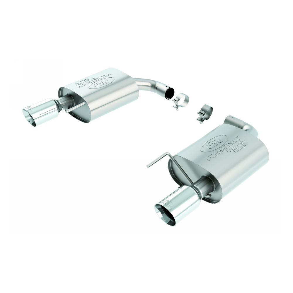 - Factory exhaust pipe must be cut to install clamp on Ford Performance axle back mufflers