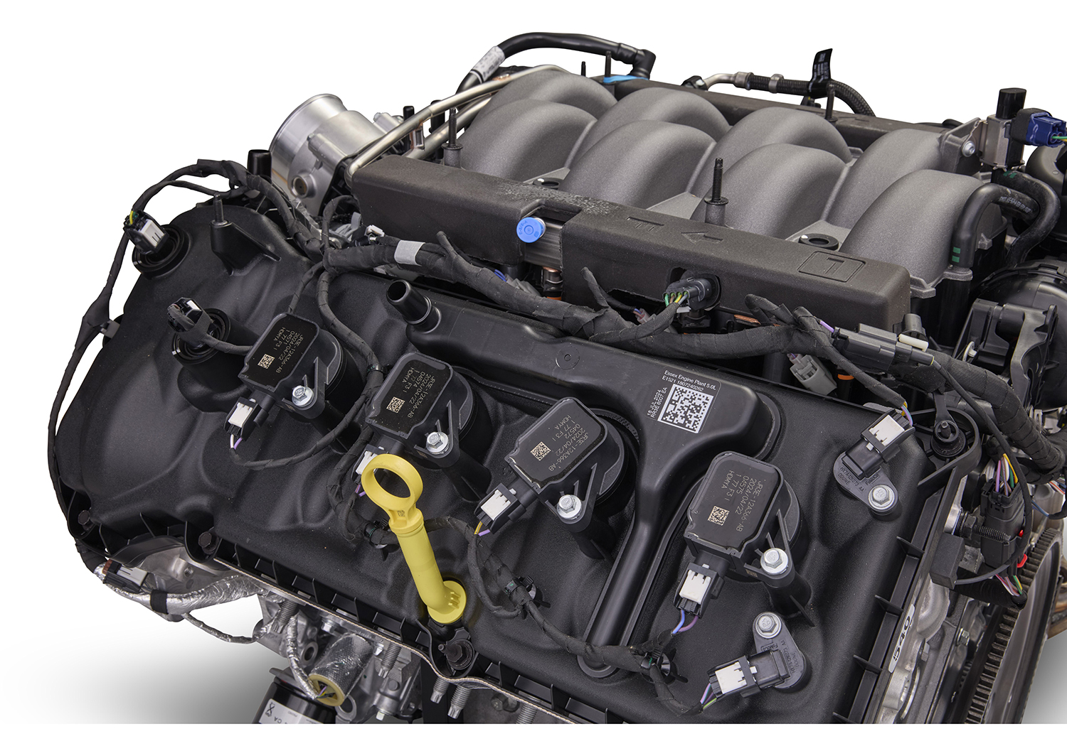 The Ford Performance all-aluminum 5.0L Coyote Gen 4X crate engine is a modern 5.0L 32-valve DOHC V-8 that utilizes advanced features such as direct and port fuel injection, twin independent variable camshaft timing (Ti-VCT), high-flow aluminum cylinder heads, and 12:1 compression to deliver 460 horsepower and 420 lb.-ft. of torque (with premium fuel). The aluminum cylinder block features plasma transferred arc spray in liners, cross-bolted main bearing caps, and thick main bearing bulkheads for strength. The Gen 4X 5.0L Coyote features a single 80mm throttle body for easier packaging in various applications.