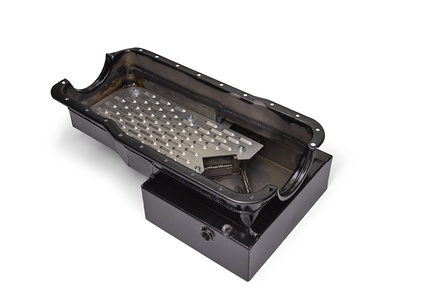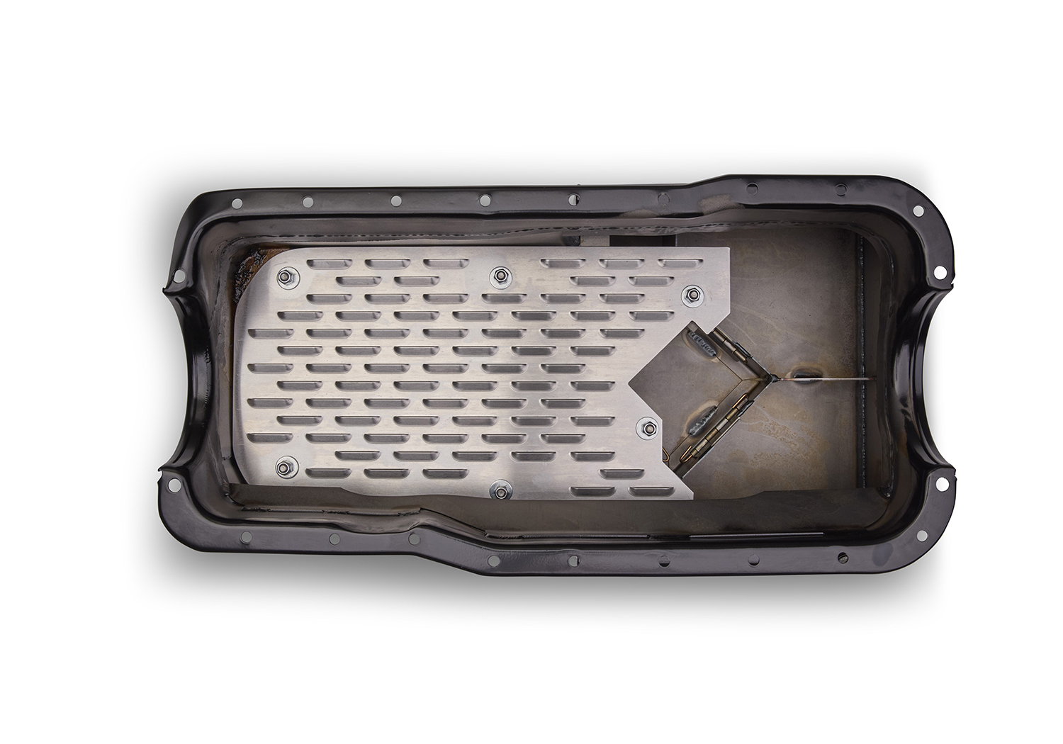 - Baffling and trap doors in the sump to keep the pickup submerged during performance driving